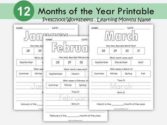 Months of the Year Worksheets Printable | Trace Write Identify Seasons and Order | Calendar Time Activities for Preschool and Kindergarten, WWF215