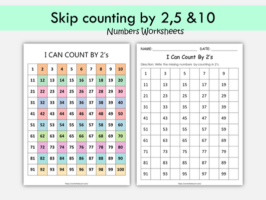 Skip Counting Worksheets, Skip Counting by 2s, 5s and 10s Charts Printables, Skip Counting Poster, Missing Numbers, Math, Kids, Kindergarten, WWF276